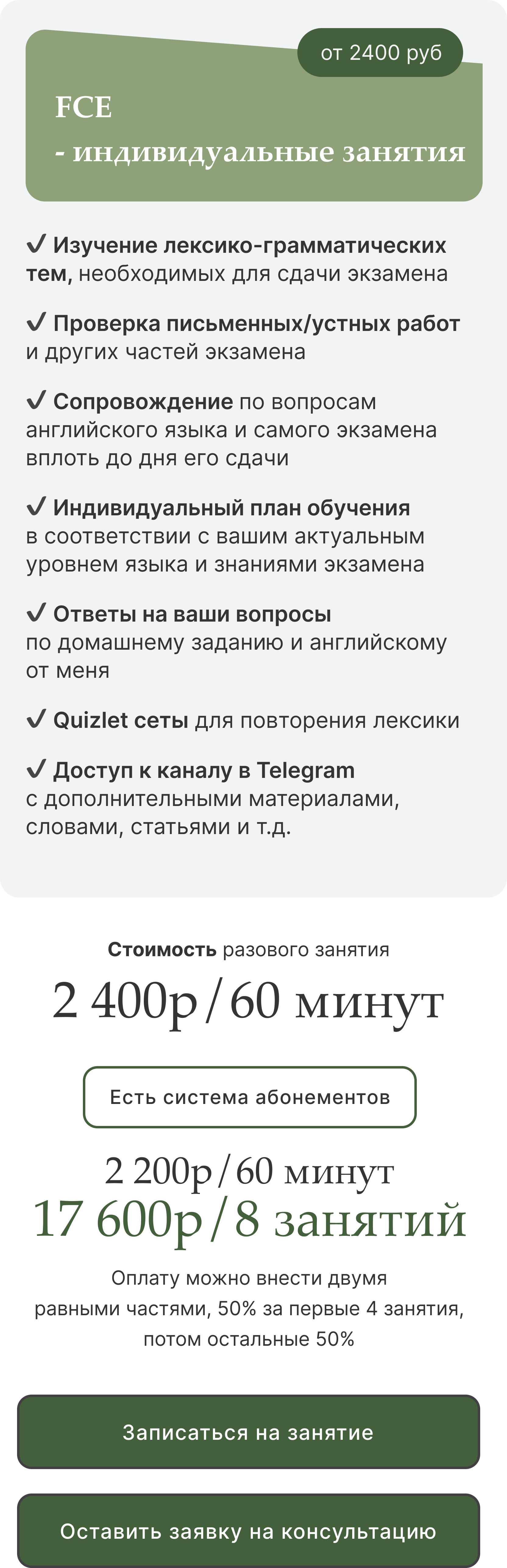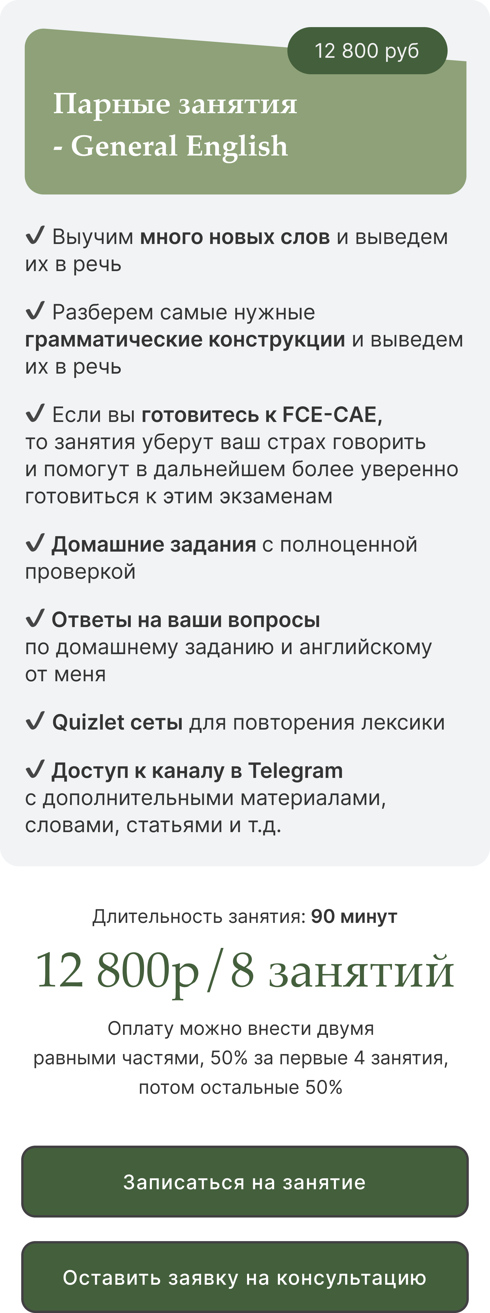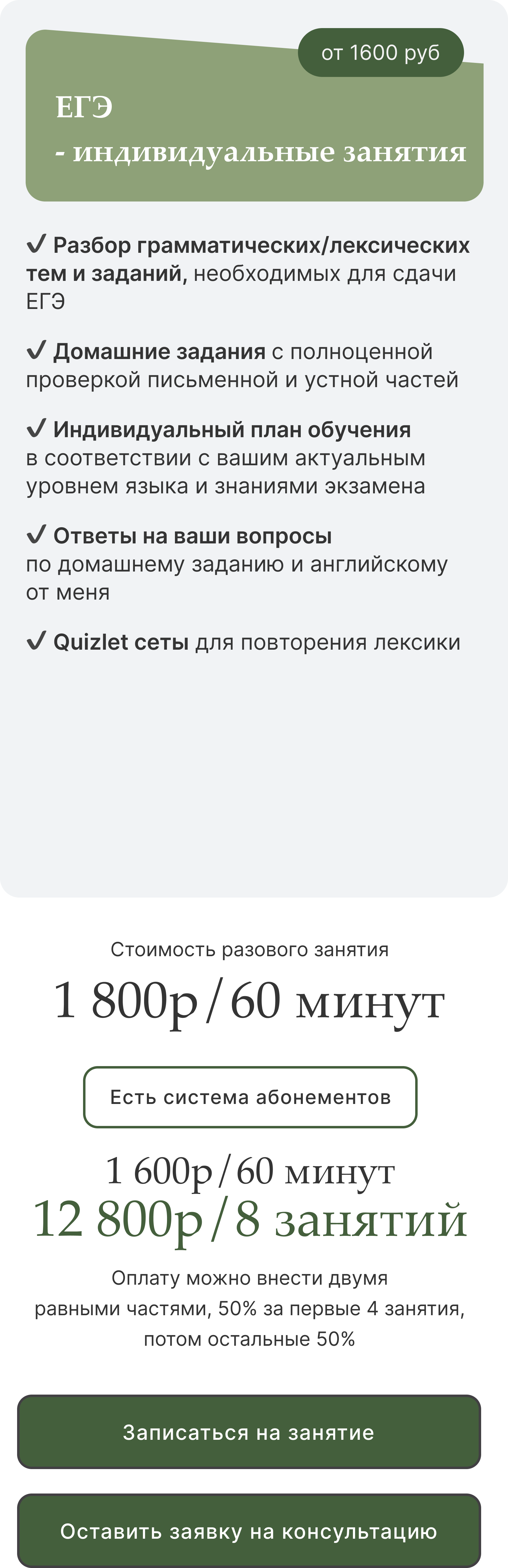 К этой цели мы будем идти вместе, разбирая задания экзаменационного формата и улучшая другие аспекты языка параллельно.