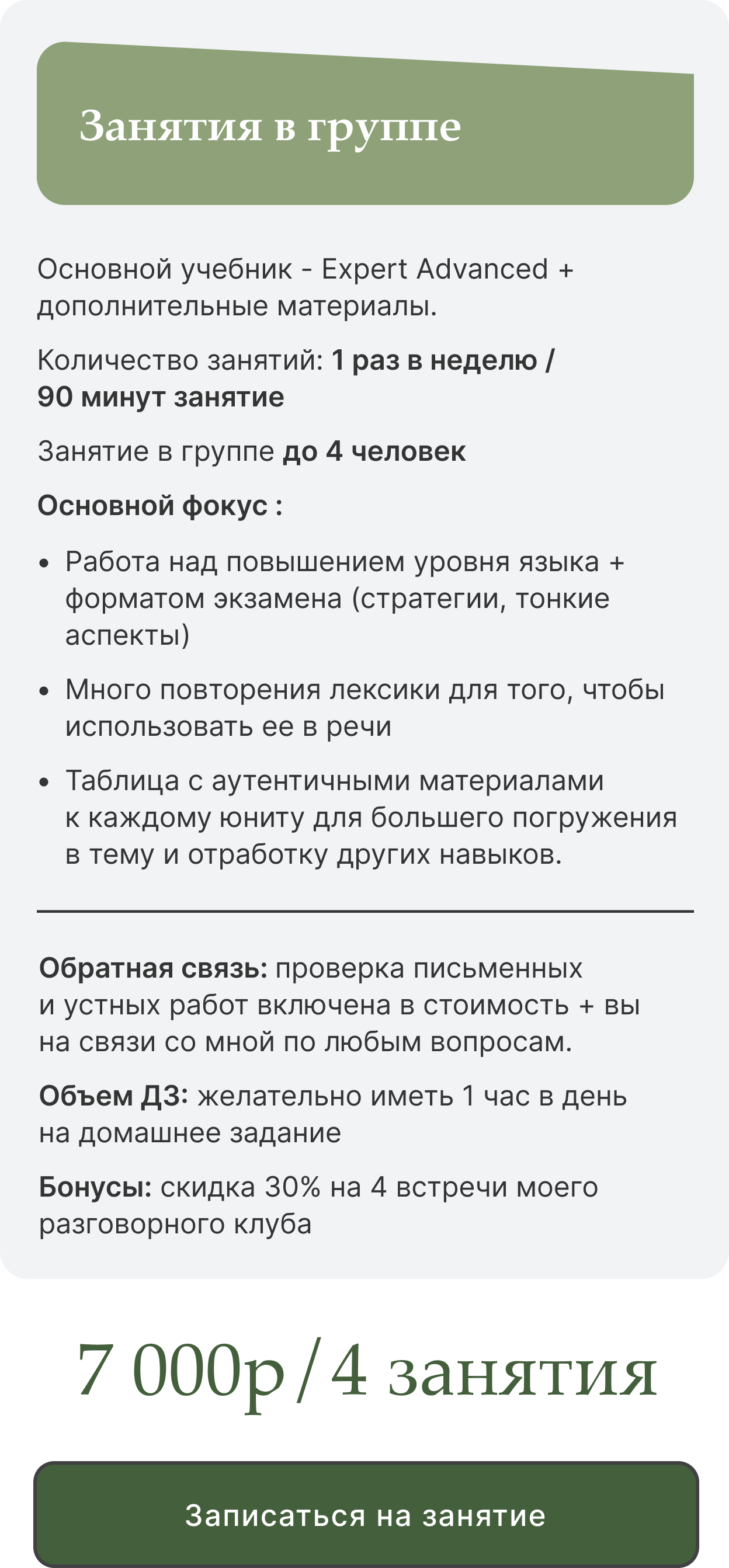 По кнопке "Записаться на занятие" перейдите в телеграмм и напишите слово «тест», и я отправлю вам тестирование на уровень языка