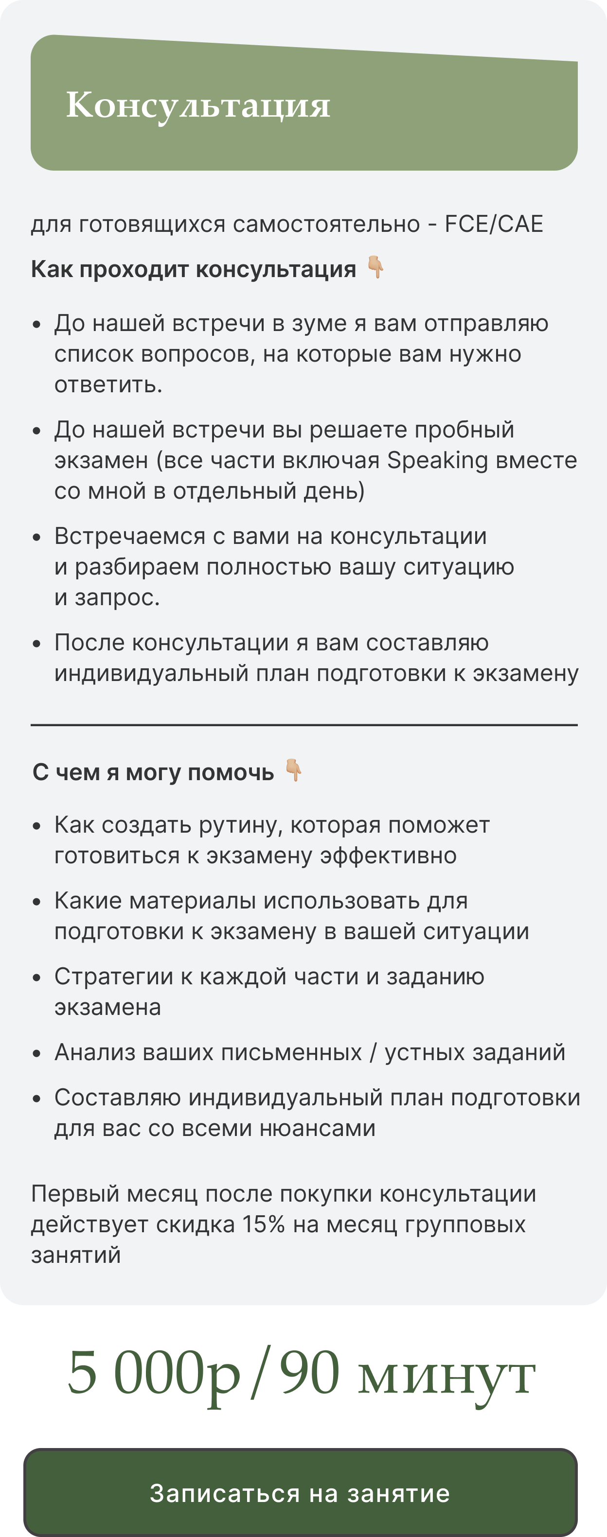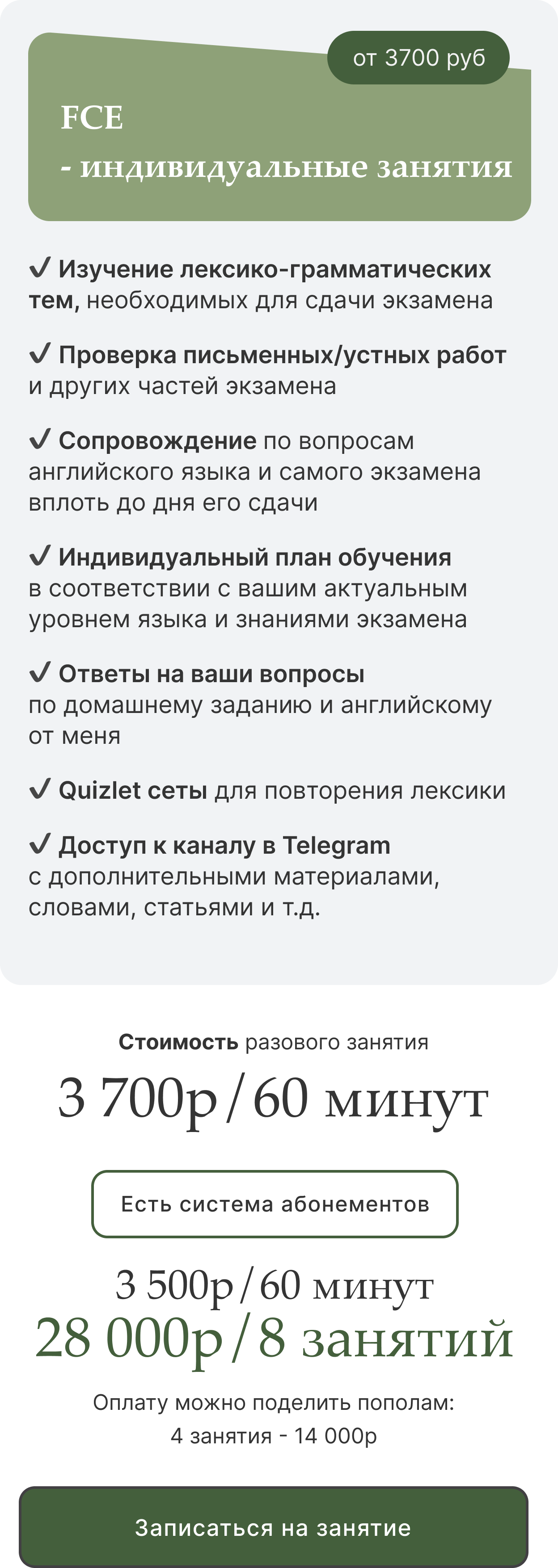 Для достижения высокого результата в столь короткий срок был составлен индивидуальный план работы с использованием материалов серии Cambridge: Gold First, FCE Practice Tests,